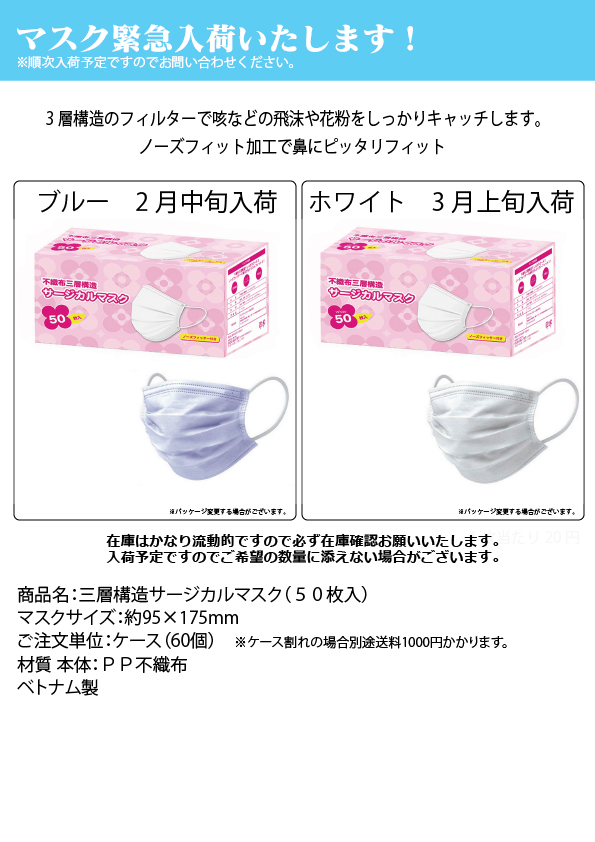 マスク販売に関しまして 突発的な大口受注により一時的にではございますが品薄になる状況が発生し皆様にご迷惑をおかけしたことを深くお詫び申し上げます。 現在メーカーとの連携で安定供給が可能となりましたので即納対応を再開いたしております。 追加 小さいサイズ(子供用)は4月20日頃からの出荷予定です。